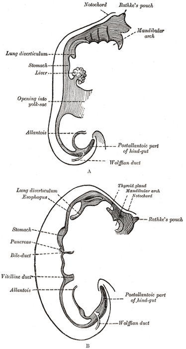 Sketches in profile of two stages in the development of the human digestive tube. (His.)