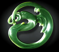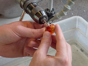 [Gem carver, Alex Horst, using a fixed arbor for carving a citrine--note water drip and the differently shaped diamond tools used in each picture] A great master in the art of gem carving, Donn Salt, who specializes in New Zealand nephrite jade and other local stone materials, provides, on his website, a step by step journey through the process of creating this artwork, "Uroboros" which is based on a Maori traditional form.