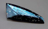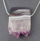 [Covellite cab with an apex top, tablets of amethyst and dendritic chalcedony] Beads: Beads are one of the most ancient types of fashioned gems, and are enjoying an enormous resurgence in popularity today. There are beading magazines and books galore, and most towns of any size have stores that sell beads along with supplies for stringing them. The Lapidary Journal, the most widely read, monthly general lapidary magazine, each year devotes it's October issue to beads.