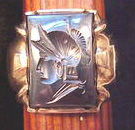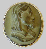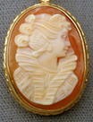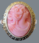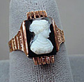 [Circa 1st century BCE Roman chalcedony itaglio (set into a contemporary ring), and the impression made by it in clay: Image courtesy www.bcgalleries.com.au, Victorian Era man's hematite intaglio ring: Image courtesy of Sunday and Sunday Antiques, a sard "cuvette" (a type of intaglio or other carving which is cut into a concave depression in a gem)] 2) Cameo: Cameos are essentially the reverse of the intaglio idea, in which by cutting away the material around it, the design is raised above the level of the base. The most common subject matter was (and still is) beautiful ladies or historical or religious figures in profile, and the materials used frequently have differently colored layers which can be strategically revealed in forming or embellishing the image. Historically, shell and agate were two of the most commonly used cameo materials, although there have been bursts of popularity of a great many other materials like jet, coral, and even lava!