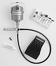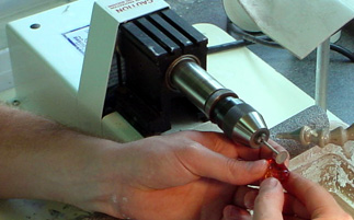 [A flex shaft tool with an assortment of "bits"] When using a flex shaft, which is usually hung on a stand and operated by a foot switch, the item being worked is mounted in a vice or held stationary in some way while the rotary tool, held like a pen in the hand, is used to grind or polish it.