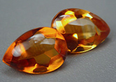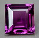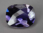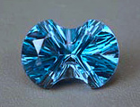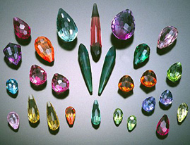 [Oval brilliant cut amethyst, square step cut amethyst, oval mixed cut blue zircon] [Apex cut square Mexican opal, rectangular opposed bar cut citrine, rectangular cushion checkerboard cut iolite] Less frequently seen variations of the faceted gem are buff tops, briolettes, concaved cuts and fantasy cuts. A buff top gem has a faceted pavilion with a smoothly domed (cabbed) crown. An interesting magnifying effect of the pavilion facets is achieved by doing this. The briolette (mentioned earlier as a popular bead style) is a three dimensionally faceted gem, usually in a pear or tear drop shape. Concave cuts have, logically, concaved or sunken in facets on either the crown or pavilion or both. This technique increases overall light return and creates unusual reflective patterns and/or face-up outlines. The "laps" which are used for concave cutting are cylindrical. Relatively few facetors have the equipment and expertise necessary to produce stones of this sort. Extra time to attain a good polish, and more expensive equipment are two factors which tend to set a premium price for such gems. Fantasy cuts have carved areas on the crown or pavillion, which may be polished, or left unpolished to create special effects.