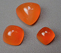 They are usually produced with a slightly beveled bottom edge which makes for easier and more secure setting in jewelry. Sizes range from tiny accent gems to large pieces appropriate for use as belt buckles or in bola ties. Standard shapes such as ovals and rounds are commonly produced in "calibrated" sizes that fit exactly into commercial mountings. In other cases, particularly with rare or valuable material, or those intended for designer jewelry, the sizes aren't standard, and the shapes may be freeform.