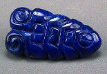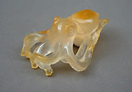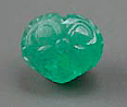 [Surface carved aquamarine, emerald, and moonstone cabochons, reverse carved rock crystal quartz, amber and rock crystal quartz (note inset opal "sun")] 4) True Carving: When the cutting or engraving work encompasses all sides of the piece so that it's truly three dimensional, it is said to be a carving. The four most common styles for carvings are hololith, representational, stylized, and abstract.