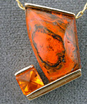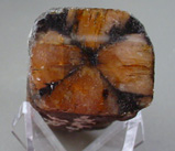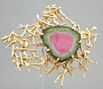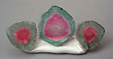 [Polished slices of a bicolored tourmaline crystal will make lovely jewelry, like this contemporary brooch: Image courtesy of www.Fraleigh.ca, specimens of nodular variscite and chiastolite with cut and polished front surfaces used for display] Cabochons: Second only to faceted stones in familiarity as lapidary products, are cabochons (cabs for short). Most commonly cabs have flat bases and smoothly domed tops, and are fashioned from translucent to opaque materials. The cabochon form is particularly good at emphasizing the patterning of a gem, or for displaying most types of optical phenomena.