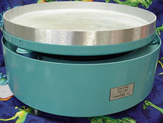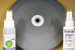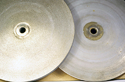 [Lapidary adhesives (epoxy, "super glue" and facetors' wax), a faceting index gear, brass dops] The laps used for cutting and polishing come in a variety of materials and sizes. The first picture below shows two diamond-surfaced cutting laps: the one on the left has a coarse diamond grit embedded into its metal surface, it would be used to lay in the basic shapes of the facets, the other one has finer grit and would be used to smooth the facets and prepare them for polishing. The second picture shows a polishing lap which is made of a plastic resin with fine metal particles embedded in it, very fine grit diamonds (in solution) are sprayed onto the lap surface for polishing the gem. Metal oxide slurries or sprays (such as cerium or aluminum oxides) can also be used for some gem materials.