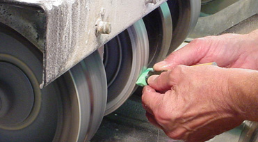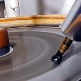 Grinding and Polishing Once a gem has been sawn into slices or trimmed into manageable size, it is then ground to smoothness and polished to a luster. The grinding machines employ a metal, or in some cases resin, disk with its surface or edge covered with abrasives or polishes of various grit sizes and types. These disks come in two basic styles: flat "laps" which are used horizontally, and upright "wheels" which are used vertically.