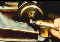 [A diamond being cleaved, one being sawn: Image courtesy of Daems Diamonds ] 3) Bruting: The job of the "bruter" is to create the face up outline of the gem: round, oval, marquis, etc. The time honored technique for doing this involves using one diamond to grind another and is done mostly by eye using a lathe-like apparatus. When bruting is done with too much force, or too much heat is allowed to build up, tiny whisker-like feathers can be seen around the girdle of the stone. This is a blemish called a "bearded girdle".