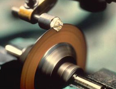 The cutting and polishing process is really one of simple (but painstaking) abrasion as the tiny diamond crystals in the oil, being forced against the rough with great speed and pressure, successively wear away minute bits of diamond from the surface, gradually making it more smooth and uniform. Because the bort particles are randomly oriented, there are always at least some whose exposed crytal faces are harder than the surface to be polished (this is true as long as the diamond has been properly oriented for cutting to begin with--> its own hardest crystallographic axis cannot be directly parallel to any facet.)