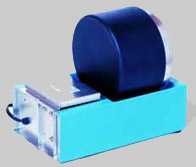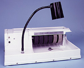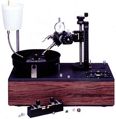 [A jamb peg faceting machine] A modern, highly engineered faceting machine is seen below: such machines accomplish the same three goals (angle, depth, and radial position of facets), but do so with great accuracy. In machines of this type the dop stick with the gem attached to it, is fitted into a "quill" which can be postioned at various precise angles via the "protractor". The quill moves up and down on the mast, which gives great control over the depth of cut, and a slotted index gear gives accurate control over the radial placement of facets. Stones cut on such equipment are usually described as "custom cut".