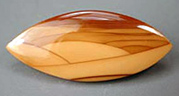 [Lapidary Keith Horst, cutting a cabochon of chrysoprase] [Cabochons of standard form: round fossil ammonite, cat'seye apatite, carnelian set, long oval hydrogrossular garnet, boat shaped Bruneau jasper] Some common variants of the cabochon form include gems cut with a series of curves that meet on top to form an apex rather than a standard smoothly curved dome, and those whose top is a flat table, a type usually referred to as a "tablet". Cabs of very dark translucent material, like deep red almandite garnet, are sometimes cut with the back hollowed out to lighten their color.