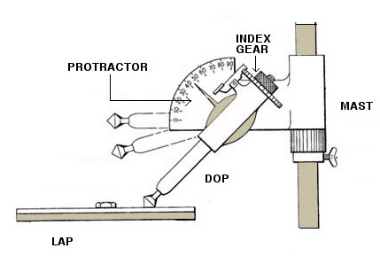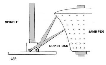 Faceting Tools In the figure below you can see the basic set up of a traditional jamb peg faceter. The spinning lap provides the grinding and polishing surface, the wooden "dop" sticks to which the rough is adhered, serve to hold the stone in position as various cuts are made. The angle of the cut is controlled by placing the dop stick in a particular hole, the depth of cut is controlled by the amount of time the piece spends in contact with the lap and how hard the facetor presses down on it, and the radial position is controlled by removing, slightly rotating, and reinserting the dopstick in its hole as each different cut is made. Most stones that are cut on such equipment are referred to as "native cut".