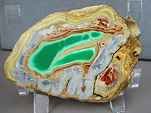 Polished slices are sometimes used in jewelry, but more often are displayed as specimens, or ornamental objects such as bookends, wind chimes, or with translucent material, "sun catchers".