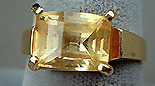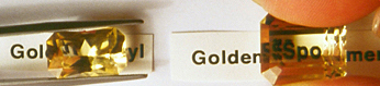 [Reflection when the pavilion angle is above the critical angle, lack of reflection "windowing"when it is not: Graphic courtesy of Joe Mirsky] In the first picture below you can see two similar looking gems (each is light yellow and rectangular). The golden beryl gem on the left was cut with its pavilion facets above its critical angle, and it appears brilliant, the yellow spodumene on the right was cut with the pavilion facets below its critical angle and has a "window". We call it a window because the light passes right through it, like window glass, so that you can easily read the printing underneath. The second set of pictures shows a top and bottom view of a badly windowed topaz. You can see how shallow (low angle) the pavilion is. In order for this gem to be fully brilliant, the necessary recutting would reduce it's face up diameter and carat weight substantially.
