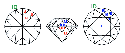 In the graphic below "B" = bezel facets, "M" = main facets, "S" = star facets, and "T" = table. ID indicates the "12 o'clock position" for the index gear. (On the left is the pavilion cutting diagram, and on the right the crown cutting diagram).