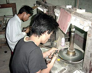[Cutters in a diamond factory in Antwerp: Image couresty of Daems Diamonds] Although there certainly are "master" cutters who can start with a piece of diamond rough, and go through all the steps to produce a finished gem; in the commerical world of diamond production, the process is usually divided into stages, each of which is accomplished by a specialist in that part of cutting.