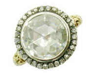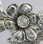 Check the text: Pages 59 - 61 in the Lyman text show diagrams of some early cutting styles [Typical antique rose cut diamonds in a circa 1840 brooch (the diamonds in this piece were probably already antique when it was made): Image courtesy of The Fraleigh Collection, and a modern-day rose cut diamond in a contemporary "antique style" ring: Image courtesy of www.antiquediamond.com] Background Information on Faceting Pavilion and Crown: In the faceted gem, the pavilion and crown have different functions. The crown acts as a window or lens to collect the light which strikes it, and direct or focus it into the pavilion of the gem, whereas the pavilion must act as a mirror to reflect that light around the pavilion, and then back to our eyes through the crown. If the pavilion fails to do so, the gem lacks brilliance and is lifeless. Crown angles are much less crucial to the optical performance of a gem than are those of the pavilion, and can vary substantially from stone to stone without severely affecting a gem's brilliance. The crown and pavilion are cut in two separate sequences of operations. The gem is initially adhered to the "dop stick" until one side is finished, then removed, turned exactly 180 degrees, and attached to a new dop, to go through corresponding operations for the other side.