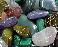 [An assortment of tumbled stones] The smooth, shiny tumbled stones can be used as accents in aquaria, or as decorations in the garden, or in the pots of houseplants. They can also be glued to "bell cap" findings, and made into pendants, charms or keychains. They are sometimes drilled to make baroque beads.
