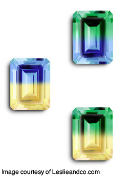 [Graphic courtesy of RioGrande Corp.] In 2004 Leslie and Company introduced the first surface diffused bi-colored topazes to complement their existing line of tradenamed diffused topaz gems.