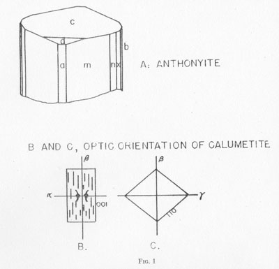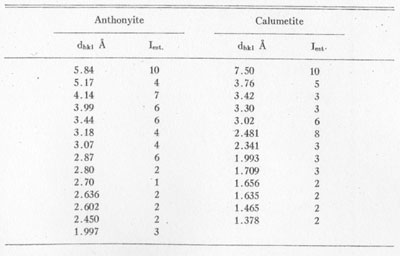 X-ray powder patterns of anthonyite were compared with those of various similar copper minerals and artificial salts1 with no semblance of a match. The strongest lines of anthonyite and calumetite are listed in Table 3.
