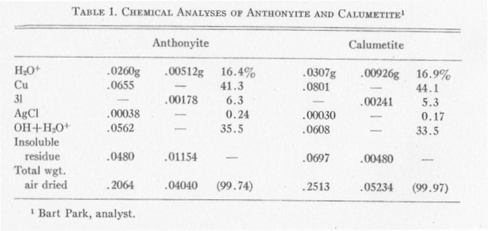 CHEMICAL ANALYSES Chemical analyses of anthonyite and calumetite were performed by Bart Park, Professor of Chemistry, Michigan College of Mining and Technology. Results of the analyses are given in Table 1. Copper was determined electrolytically, silver was determined gravimetrically and calculated to AgCl, and Cl was found gravimetrically as AgCl. Two analyses were run on each mineral; Cu and Ag were determined in the first run but the Cl was lost and had to be determined from a second, smaller sample. The H2O+ was determined by drying to constant weight at 120° C. (for the first sample) and at 140° C. (for the second sample). The values for OH+H2O+ were determined by difference - and the totals were split up into OH and H2O+ on the basis of satisfying valence requirements for cupric copper. Determination of OH+H2O by difference seems justified, since a battery of spectrographic and microchemical tests had indicated that no other elements were present. The insoluble residue consisted largely of quartz with minor amounts of epidote. ANTHONYITE The species anthonyite is named for John W. Anthony, Associate Professor of Geology at the University of Arizona. The formula obtained from the chemical analyses is: Cu.65Cl.18OH1.12·1.82H2O or: Cu(OH,Cl)2·3H2O with the ratio (OH) : (Cl) =6.3:1.