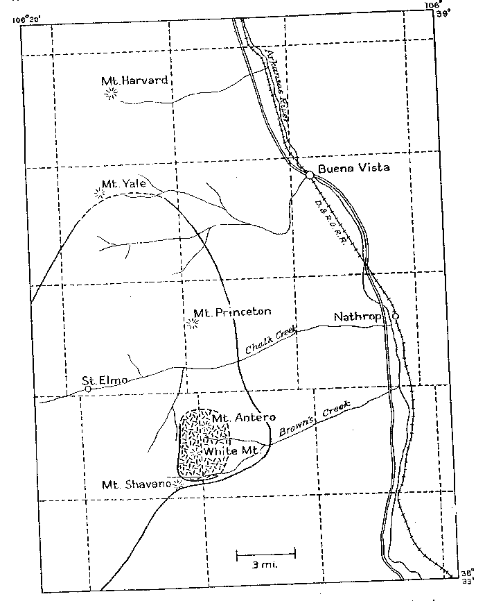 | FIG. l. Map showing location and geologic setting of Mt. Antero, Colorado. The granite stock is part of a much larger batholith of quartz monzonite, called by Crawford (1924) the Princeton batholith, and dated by him as being late Mesozoic or Tertiary in age. On the map, Fig. 1, the boundary of the Princeton batholith is shown as given by Crawford, and the smaller hatched area represents the granite stock in which the pegmatites and veins are found. The quartz monzonite is typically rather dark in color, of medium to coarse grain, and composed of subhedral andesine and green hornblende, anhedral orthoclase, quartz and biotite. The minor accessories are sphene, apatite and iron oxides. The granite is medium grained, and composed of subhedral oligoclase, anhedral orthoclase and quartz. The mafic minerals, green hornblende and biotite, are present in only small amount. Numerous fine-grained aplite dikes cut the granite and quartz monzonite. The minerals that have been described from Mt. Antero are found both in pegmatites and veins. All of the pegmatites seen were within the granite stock. The veins are in both granite and quartz monzonite. PEGMATITES AND VEINS The pegmatites are uniformly small in size, seldom exceeding 3 feet in width and extending laterally for only a few feet. Clean-cut exposures are few because of extreme frost action. All of the pegmatites and veins are found well above the timber line, in an area entirely covered with a mantle several feet deep of disintegrated rock. However, several outcroppings in vertical cliffs showed the pegmatites to be isolated lenticular bodies having sharp contacts with the granite enclosing them. Complete excavation of these pegmatites revealed that they are roughly disk-shaped or cylindrical bodies of limited extent in all directions. About 15 pegmatites and veins were studied in detail. The distinction between-pegmatite and vein is made chiefly on the basis of mineralogy, the differences in mineralogy being taken as a direct connotation of the physico-chemical conditions of deposition. On the same basis the pegmatites and veins have been further subdivided. This subdivision is done not only to facilitate description but to, point out that, although all of the pegmatites and veins arose from a common source, there are significant differences in their paragenesis, which will be discussed in a later section of the paper. The pegmatites and veins have been divided into the following types: A. Pegmatites 1. Beryl pegmatites (a) Beryl-smoky quartz 2. Phenakite pegmatites (a) Phenakite-colorless quartz (b) Phenakite-smoky quartz 3. Beryl-phenakite-bertrandite pegmatites (a) Beryl-phenakite-bertrandite (b) Beryl-phenakite-bertrandite-fluorite 4. Topaz pegmatites B. Veins 1. Muscovite-quartz vein 2. Phenakite-quartz-fluorite vein 3. Beryl-quartz-molybdenite vein