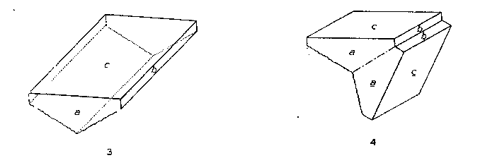 Bertrandite from Mt. Antero is found in platy crystals tabular parallel to c{001} and usually elongated parallel to the a-axis. The crystals are white or colorless and transparent, and range in size up to 1 cm. in length. Their hemisymmetric character is indicated by the fact that one basal plane is commonly flat, while the other is rounded and striated parallel to the a-axis by the oscillatory combination of the basal plane with a dome, probably ε {021}. Twin crystals are relatively common. The twin plane is (021). The twins are heart-shaped in cross section, with the smooth basal plane on the outside. The appearance of single and twinned crystals of bertrandite from Mt. Antero is illustrated by Figs. 3 and 4. |