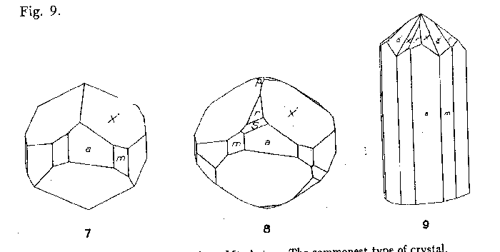 FIG. 8. Crystal of phenakite from Mt. Antero. FIG. 9. Interpenetration twin of