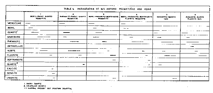 Beryl-quartz-molybdenite vein. This deposit has already been described by Landes (1934). It is only mentioned here to complete the picture of the apparent gradation in the Mt. Antero region from pegmatite to vein. The beryl-quartz-molybdenite vein is not found within the granite stock to which all previously described localities were confined. It is in the surrounding quartz monzonite, about one half mile from the granite contact. The presence of beryl in the vein indicates that the mineralizing solutions arose from the granite stock in which so many beryllium-rich pegmatites are found, and that it can, therefore, be considered as an outlying part of the same general zone of mineralization. SUMMARY AND CONCLUSIONS With the exception of the beryl-quartz-molybdenite vein, the pegmatites and veins of the Mt. Antero region are all found entirely within a single small granite stock, and presumably, therefore, arose from a common source. The paragenetic table (Table 1) of the various deposits described brings out the broad similarity between them, and also several significant differences. These differences are an expression of the physicochemical conditions obtaining during the formation of any particular pegmatite or vein. The most important factors that may have governed the paragenesis of the pegmatites and veins are: (1) chemistry, (2) pressure, (3) temperature and rate of change of temperature, (4) wall-rock control. The paragenetic table shows all of the pegmatites and veins to be similar chemically in that they contain essentially the same elements, as might be expected since they arose from a common source. However, the relative proportions of the elements vary widely in different occurrences. It is probable that the most important influence of variation in chemistry of the primary solutions has been to control the amounts of the various minerals present. Speculation about pressure effect upon the paragenesis of the pegmatites and veins is difficult. All of the bodies are found within a horizon 500 feet thick, and the difference in pressure due to load was not, therefore, very large. More important than this, however, would be the variation in hydrostatic pressure of the solutions, which might be governed by the size of the channel-ways through which the solutions moved. However, since the direct effect of reduced pressure would be to lower the temperature of the solutions, these two factors may be considered to be interdependent. The granite in which the pegmatites and veins are found is very uniform throughout, and the possibility of wall-rock control is slight. The major dissimilarity in paragenesis is between the two groups which have been described as pegmatites and veins. Included in the pegmatite group are all those dikes or lenses of coarsely crystalline microcline and quartz, either together as graphic granite or as individual crystals; that is, those bodies whose early phase at least, was probably magmatic. Included in the vein group are three dikes that are vein-like in shape, and are composed chiefly of typical milk-vein-quartz, with graphic granite and microcline entirely lacking. There can be little doubt that the fundamental differences between pegmatites and veins were caused by temperature of formation. This is brought out clearly in Table l, assuming that from top to bottom in the table is a direction of decreasing temperature. In the true pegmatites (columns 1-4) microcline and beryl were the first minerals to form, and were, therefore, formed at the highest temperature and probably crystallized from a medium close in its properties to a true magma. Following the crystallization of microcline and beryl in the pegmatites came the typical hydrothermal introduction of lower temperature minerals. The veins in their entirety are essentially equivalent to the hydrothermal phase of the pegmatites. The muscovite-quartz vein has highly silicified and altered granite wall rock, and its general nature gives the impression that it was created by the early hydrothermal solutions of a typical pegmatite which escaped from the pegmatite magma chamber into a crack or fissure in the granite. The close association of this vein with several true pegmatites supports this idea. The phenakite-quartz fluorite vein has unaltered, sharp contacts with the granite wall rock and, therefore, appears to have formed at a still lower temperature than the muscovite-quartz vein. For the same reason the beryl-quartz-molybdenite vein apparently formed at a relatively low temperature. Apparently all the pegmatites started to crystallize at about the same temperature. The paragenesis of the individual pegmatites is broadly similar. The lack of certain minerals in some which are present in others, and the differing amounts of the various minerals, can be attributed to slight compositional differences in the solutions which introduced the hydrothermal minerals, and to a varying rate of change of temperature. The paragenetic table (Table 1) shows phenakite to be stable at a lower temperature than beryl, and quick cooling past the stability range for beryl might prevent its crystallization, resulting in the formation of phenakite at a lower temperature. Temperature of formation. Any precise statement as to the temperature of formation of a pegmatite is of doubtful value. However, for at least some of the pegmatites of the Mt. Antero region (the beryl-smoky quartz type), it is known that the smoky quartz formed as low-quartz, and thus crystallized at some temperature below 573°C.1 Since smoky quartz was the third mineral to start to crystallize it seems probable that the upper temperature limit of the pegmatites could not have been much greater than 600°C. It has been established by various investigators that the temperature of formation of adularia is about 230°C. On this basis the lower temperature of formation of the phenakite-quartz fluorite vein will be some figure below this value, perhaps as low as 1