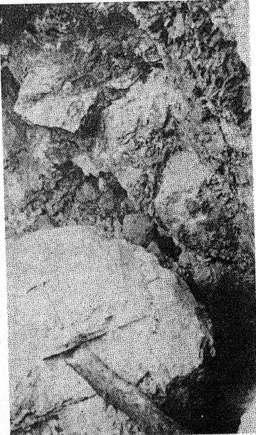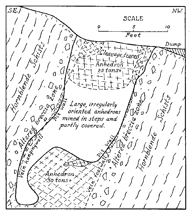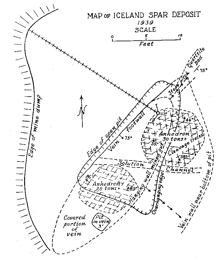 Some banded pieces observed under a binocular show very tiny dendritic growths of the pink material more or less normal to the planes of banding. These are suggestive of the "silicate gardens" produced by soluble compounds absorbed in silicate gels. Pycnometer specific gravity determinations of the Iceland spar and pink banded calcite were made for reference. The following are values obtained at room temperature: Iceland spar ........ ...... ................ 2.716 Pink spar ....... ............... .......... 2.721 Large Crystals. Although the vein as exposed is rather small, some of the crystals are gigantic. Portions of two very large crystals were exposed on the side and bottom of the pit at the time of study by the writer. The larger of these occurred practically at the surface with cleavage traces oriented as shown in Fig. 2. The southwest side of the pit (Fig. 1) coincided with the third rhombohedral cleavage direction which was vertical with strike S 72° E. The top of this crystal had been partly eroded away. The crystal extended into the southwest wall for at least two feet at the top. About six feet of the crystal had been mined away on the northeast side. The more striking anhedral crystal occurred in the bottom of the pit with the c-axis nearly vertical as shown in Fig. 2. This crystal was exposed on three sides including a portion of the underside. Some of the exterior of the crystal had been stripped off by mining. Before the end of 1939 the entire crystal was removed but a very good idea of its size and position can be obtained from Fig. 3. From the dimensions of the remaining crystal at the time of the study it is estimated to have weighed at least thirty tons, or possibly as much as forty tons before it was partially mined. Both of these crystals rank second in size to the large Iceland crystal described by Des Cloizeaux and recorded by Palache. 11Origin. Points to be considered in connection with the genesis of the Iceland spar deposit are: (1) the brecciation zone in the wall rock, (2) the nature of the wall rock alteration, (3) the purity of the calcite, and (4) the pink banding of the calcite. The brecciation is spacially and genetically related to the calcite vein. It is a peripheral zone about the vein and has no extension beyond a few feet in any direction from the vein. The breccia is a mechanical one rather than a replacement breccia. It is not a fault breccia as indicated by Johnson, 12 and little or no slickensiding is present. The volume of the breccia as compared to the size of the vein is large as in many breccia pipes. Thus the channelway for the carbonate solution appears to have been produced by rapidly released gaseous emanations which moved upward from depths along the foliation of the hornblende schists. A small lenticular, pipe-like channel produced by such means would be clogged by large angular blocks torn from the walls. At least locally, the void space might be considerable.The gaseous emanations producing the pipe were probably in part responsible for the alteration of the breccaated wall rock. However, some of the alteration, if not a major portion, was produced by the carbonated solutions which later deposited the calcite. Some supergene kaolinization was effected in the top of the alteration zone. This is whitish in color in contrast to the green coloration of the altered wall rock deeper in the deposit. Because of the difficulty encountered in a mineralogic and petrographic study of the altered rock, spectrographic analyses were made of the material. These investigations indicate rather clearly the hypogene nature of the wall rock alteration. Several analyses were made of typical unaltered hornblende schist adjacent to the walls of the deposit. Several similar analyses were also made of the various stages of altered wall rock. By comparison with the unaltered rock, the altered material showed additions of nickel, barium, bismuth, chromium, and molybdenum. The presence of these elements in the altered rock and their absence in the original wall rock precludes any probability that the alteration was supergene. Was the calcite of the vein deposited by filling of a cavity already present or by replacement of much brecciated material, or by both processes? The deposit shows no characteristics of cavity filling such as crustification, banding, or primary vugs. However, recrystallization could have obliterated such primary structures. Some filling of space in the breccia pipe must have occurred since a pipe so conceived would in all probability contain numerous super-capillary openings. It might be suggested that the very purity of the calcite should indicate an origin by filling of an open cavity or pipe because replacement would contaminate the solution so as to prevent deposition of pure calcite. But this is in effect proposing that host minerals cannot be replaced without leaving some trace in the metasome, or that replacement cannot be complete. If purity of a vein or a mineral be used as a criterion of cavity or fissure filling, then all veins of pure quartz, pure calcite, pure pyrite, etc., must be of such origin. A criterion of this nature would relegate replacement to a minor role in mineral deposition. In spite of purity of the calcite it is believed that replacement was the principal mode of deposition of the vein, although filling of the void space present in the pipe necessarily took place.