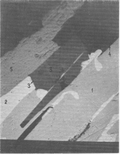 New lead-silver sulfoantimonite A new lead-silver sulfoantimonite was found in the ore. This mineral, which forms fine intergrowths with galena, freibergite, jamesonite, and carbonate (Fig. 1) has been studied by microscope and microprobe in more than twenty grains. In most of these grains it is the main phase. A microprobe analysis of this mineral gave (weight percent): Pb 56.81; Ag 3.45; Sb 22.59; S 18.69; sum 101.54. Recalculation of this analysis to 16 cations yields the formula Ag1.04Pb8.91Sb6.05S18.96. Ideal formulas are AgPb9Sb6S18.5 or Ag2Pb18Sb12S37. This composition (#8 in Fig. 2) lies along a trend of previously known silver-antimony-lead sulfosalts. The powder-diffraction data are given in Table 1. In polished section, this sulfosalt resembles the others of this series. It is especially similar to jamesonite, with which it occurs. Both exhibit approximately the same anisotropism and bireflectance (Fig. 3), and both are characterized by two directions of cleavage - longitudinal perfect and transverse indistinct. This sulfosalt is slightly greenish in comparison to galena but less intense than the green of freibergite. Oriented inclusions of galena are common along the cleavages of the sulfosalt (Fig. 1) but less common in the accompanying jamesonite. Freibergite occurs as rare intergrowths and thin veinlets within the sulfosalt. The freibergite is characterized by the presence of inclusions of a Mn- and Fe-bearing carbonate which is not present in the other phases. It contains 16.0-30.6 weight per cent Ag. New silver-iron sulfide A new sulfide of iron and silver, (Fe,Ag) xS, was found in a carbonate-rich portion of the ore, where it is accompanied by pyrrhotite, sphalerite, antimony, and meneghinite. Microprobe analysis indicates that this mineral contains 10.50 to 22.62 weight percent silver and 47.44 to 54.51 weight percent iron, which is equivalent to Fe0.93Ag0.23S1.00. This composition and an X-ray diffraction pattern and optical properties (Fig. 4) are very similar to those of pyrrhotite and suggest that this phase is an argentian pyrrhotite. This phase tarnished rapidly when exposed to air, with the development of a reddish to violet film.