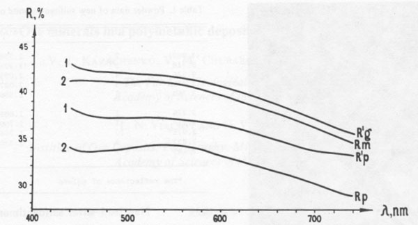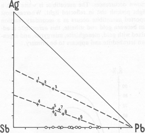 Antimonian gold Antimonian gold has also been found in the carbonate ore. This gold, of composition (weight percent) Au 98.08, Sb 3.17 (Au 0.95Sb0.05), occurs as inclusions with meneghinite, sphalerite, galena, pyrrhotite, miargyrite, and argentian tetrahedrite in carbonate, sometimes as a border along grains of aurostibite. The reflectance of this phase (Fig. 5) is considerably less than that of pure gold and has a maximum at about 650nm.The aurostibite of this deposit has a composition of Au 0.90Sb2.10(Au 41.27, Sb 59.77 weight percent), which is considerably more antimonian than most known occurrences. The aurostibite is white with a slight pinkish tint in reflected light. Whereas most reported aurostibite occurs as a secondary reaction rim between gold and stibnite, this aurostibite is admixed with gold, meneghinite, miargyrite, and argentian tetrahedrite and appears to be primary. Table 2. Powder data of (1) the iron-silver sulfide, and (2) the main reflections of pyrrhotite according to Berry and Thompson (1962, p. 60)