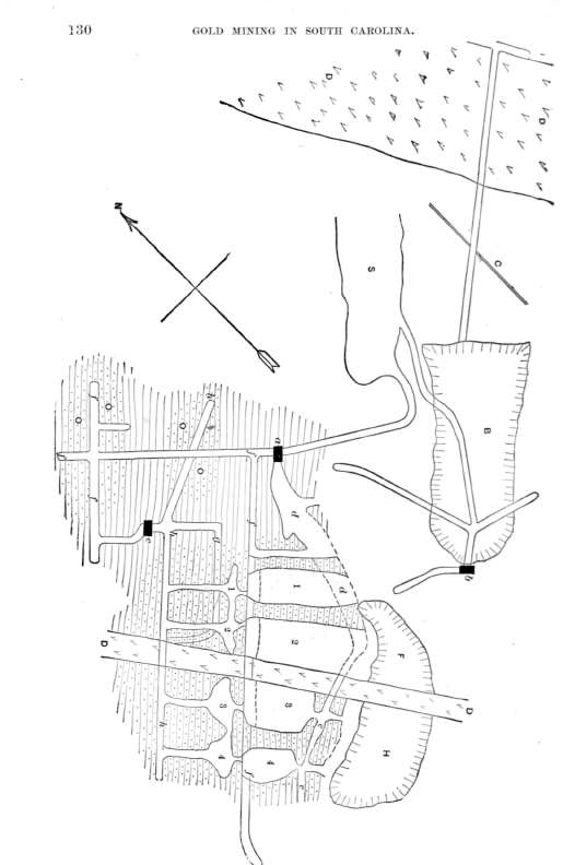 Fig. 23. Plan of Cross Mine (part of the Haile Gold Mine). Scale, 1 inch=100 feet. B, Bumalo pit; C, clay dike ; D, diabase dikes ; F, Flint pit; H, Haile pit; S, old stope, 200-foot level; a, No. 2 shaft; b, No. 3 shaft; c, new shaft; d, bottom of old stope, 160 feet, rising to 100 feet: e. 120-foot level; /, 200-foot level: g and h, 270-foot level; O, ore-bodies ; 1, 2,3, 4, stopes.