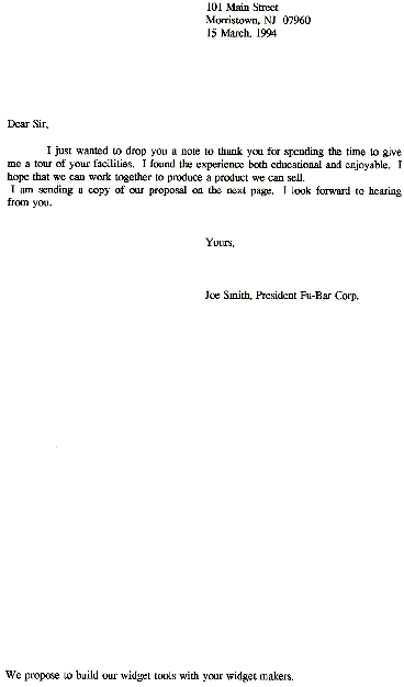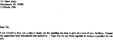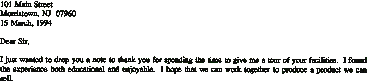 .nf 101 Main Street Morristown, NJ 07960 15 March, 1994 Dear Sir, .fi I just wanted to drop you a note to thank you for spending the time to give me a tour of your facilities. I found the experience both educational and enjoyable. I hope that we can work together to produce a product we can sell.