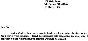 .sv 0.5i .nf 101 Main Street Morristown, NJ 07960 15 March, 1994 .sp 1i Dear Sir, .fi I just wanted to drop you a note to thank you for spending the time to give me a tour of your facilities. I found the experience both educational and enjoyable. I hope that we can work together to produce a product we can sell.