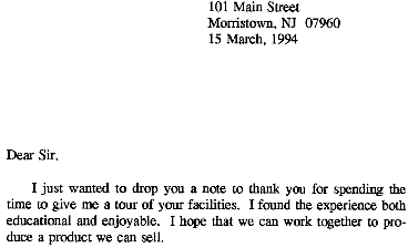 .nf 101 Main Street Morristown, NJ 07960 15 March, 1994 .sp 1i Dear Sir, .fi I just wanted to drop you a note to thank you for spending the time to give me a tour of your facilities. I found the experience both educational and enjoyable. I hope that we can work together to produce a product we can sell.