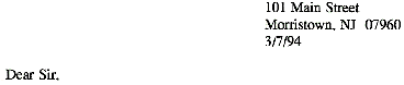 .nf .ll 4.0i .in 2.0i 101 Main Street Morristown, NJ 07960 15 March, 1994 .sp 1i .in 0 Dear Sir, .fi .ti 0.25i I just wanted to drop you a note to thank you for spending the time to give me a tour of your facilities. I found the experience both educational and enjoyable. I hope that we can work together to produce a product we can sell.