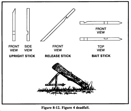The figure 4 is a trigger used to drop a weight onto a prey and crush it (Figure 8-12). The type of weight used may vary, but it should be heavy enough to kill or incapacitate the prey immediately. Construct the figure 4 using three notched sticks. These notches hold the sticks together in a figure 4 pattern when under tension. Practice making this trigger before-hand; it requires close tolerances and precise angles in its construction.