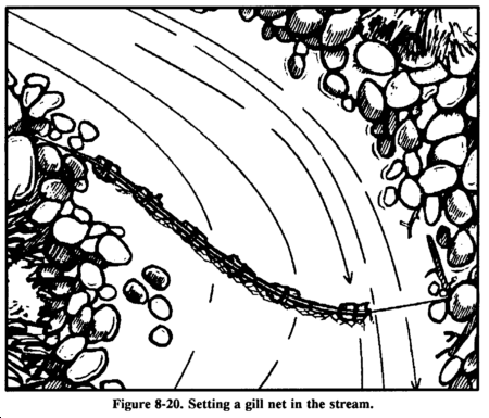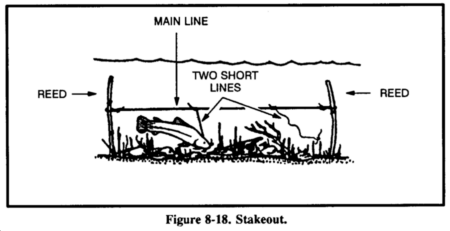 A stakeout is a fishing device you can use in a hostile environment (Figure 8-18). To construct a stakeout, drive two supple saplings into the bottom of the lake, pond, or stream with their tops just below the water surface. Tie a cord between them and slightly below the surface. Tie two short cords with hooks or gorges to this cord, ensuring that they cannot wrap around the poles or each other. They should also not slip along the long cord. Bait the hooks or gorges.