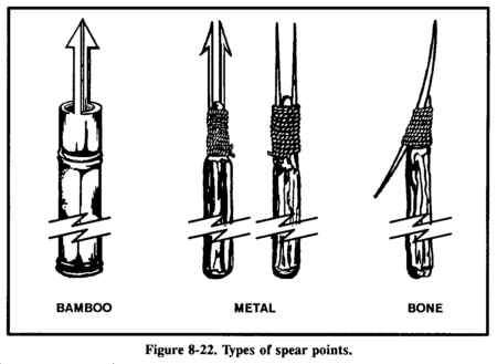 If you are near shallow water (about waist deep) where the fish are large and plentiful, you can spear them. To make a spear, cut a long, straight sapling (Figure 8-22). Sharpen the end to a point or attach a knife, jagged piece of bone, or sharpened metal. You can also make a spear by splitting the shaft a few inches down from the end and inserting a piece of wood to act as a spreader. You then sharpen the two separated halves to points. To spear fish, find an area where fish either gather or where there is a fish run. Place the spear point into the water and slowly move it toward the fish. Then, with a sudden push, impale the fish on the stream bottom. Do not try to lift the fish with the spear, as it with probably slip off and you will lose it; hold the spear with one hand and grab and hold the fish with the other. Do not throw the spear, especially if the point is a knife. You cannot afford to lose a knife in a survival situation. Be alert to the problems caused by light refraction when looking at objects in the water.