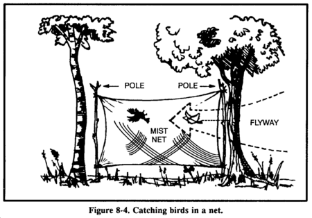 All species of birds are edible, although the flavor will vary considerably. You may skin fish-eating birds to improve their taste. As with any wild animal, you must understand birds' common habits to have a realistic chance of capturing them. You can take pigeons, as well as some other species, from their roost at night by hand. During the nesting season, some species will not leave the nest even when approached. Knowing where and when the birds nest makes catching them easier (Figure 8-3). Birds tend to have regular flyways going from the roost to a feeding area, to water, and so forth. Careful observation should reveal where these flyways are and indicate good areas for catching birds in nets stretched across the flyways (Figure 8-4). Roosting sites and waterholes are some of the most promising areas for trapping or snaring.