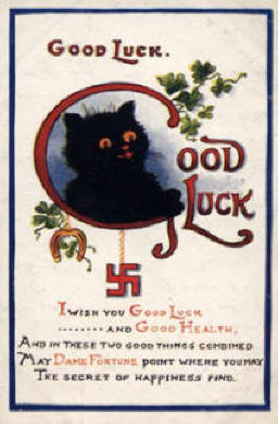Swastika svastika (Sanskrit) An auspicious or lucky object; especially applied to the mystic symbol -- a cross with four equal arms, the extremities of which are bent sharply at right angles, all in the same direction -- marked upon persons and things in order to denote good luck, although originally the symbol had a far deeper significance. Sometimes the arms are bent to the left, sometimes to the right. The symbol is very widespread, and extremely ancient, engraved on every rock-temple and prehistoric building in India, and wherever Buddhists have flourished, as well as in Greece, among the ancient Scandinavians, and in ancient America. It has been called the Jaina Cross; Fylfot, Mjolnir, or Thor's Hammer by the Scandinavian peoples; and in the Chaldean Book of Numbers the Worker's Hammer.